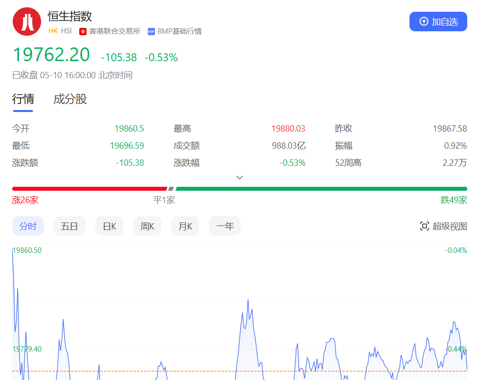综述: 5月9日,港股主要指数收盘下跌。香港恒生指数收跌2.12%,报19867.58点;恒生中国企业指数跌2.36%,报6735.13点;恒生科技指数跌2.95%,报3798.70点。行业板块方面,软件、制药等板块跌幅居前。恒指低开低走,尾盘略有上涨,截至收盘,恒指跌0.53%,报点19777.38。恒生科技指数尾盘拉升,截至收盘