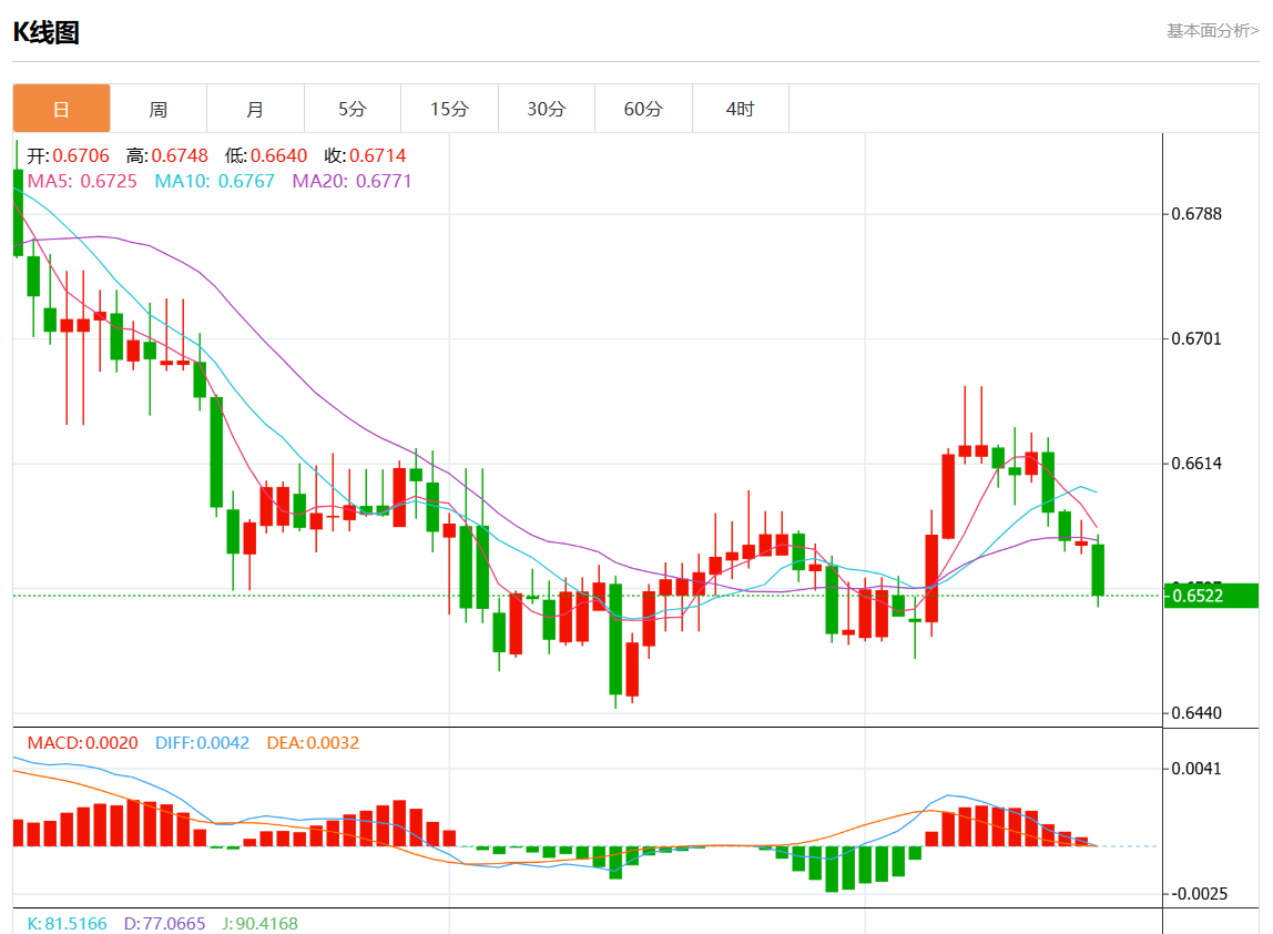 周二盘中,澳元/美元报0.6521,跌幅0.58%。 今日分析:在0.6560之下,看跌,目标价位为0.6500,然后为0.6480。 技术点评:RI技术指标向下运行。 支撑位:0.65900.65750.6560 阻力位:0.65000.64800.6465 (亚汇网编辑:静香)
