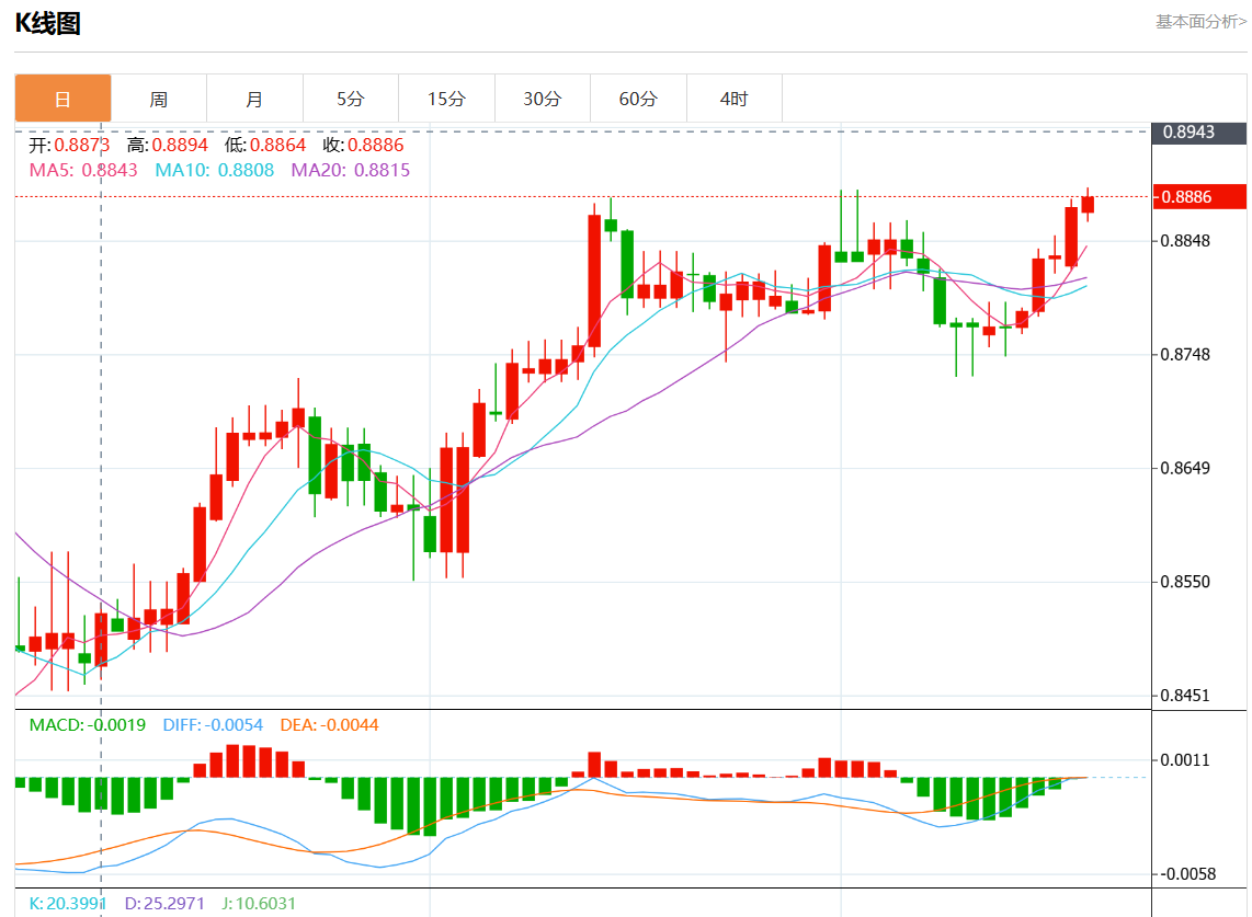 周二盘中,美元/瑞元报0.8886,涨幅0.10%。 今日分析:在0.8850之上,看涨,目标价位为0.8910,然后为0.8925。 技术点评:RI技术指标向上运行。 支撑位:0.89400.89250.8910 阻力位:0.88500.88350.8820 (亚汇网编辑:静香)