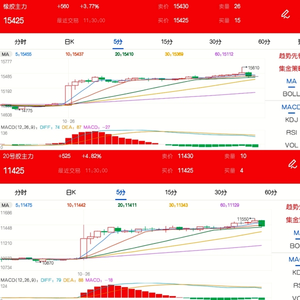 10月26日,国内商品期货午盘多数飘绿,但橡胶、20号胶期货大幅拉升,其中橡胶主力涨超3%,20号胶一度触及涨停。截至收盘,橡胶主力合约涨3.77%,报15425元;20号胶主力合约涨4.82%,报11425元/吨,最高触及11550元/吨。 分析师认为,橡胶15000元/吨一线或有一定技术压力,建议多单部分止盈后防守10日均线位置。