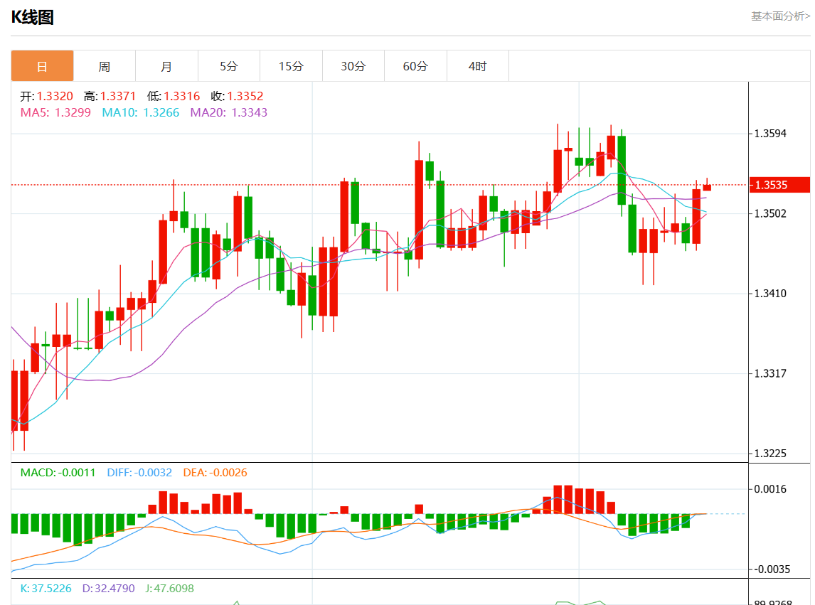 周五盘中,美元/加元报1.3538,涨幅0.06%。 今日分析:在1.3500之上,看涨,目标价位为1.3560,然后为1.3580。 技术点评:RI技术指标运行趋势复杂,倾向于上涨。 支撑位:1.36001.35801.3560 阻力位:1.35001.34801.3460 (亚汇网编辑:静香)