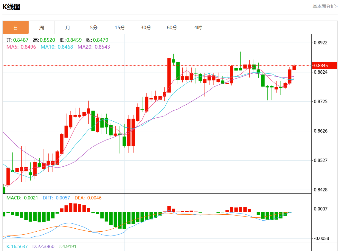 周五盘中,美元/瑞元报0.8846,涨幅0.16%。 今日分析:在0.8825之上,看涨,目标价位为0.8855,然后为0.8870。 技术点评:RI技术指标向上运行。 支撑位:0.88850.88700.8855 阻力位:0.88250.88100.8795 (亚汇网编辑:静香)