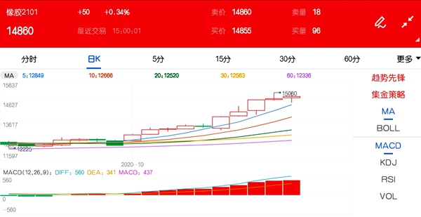 十月份以来,橡胶期货开启一波凌厉的上涨走势。主力2101合约涨幅一度高达20%。自12600元/吨附近起步,短短几个交易日一跃上破15000元/吨,昨日更是创下15060元/吨高位,为主连近三年最高水平。截至今日下午收盘时,2101合约稍有回落,收于14860元/吨,上涨0.34%。 另据外媒消息,日本橡胶期货周三触及逾三年高