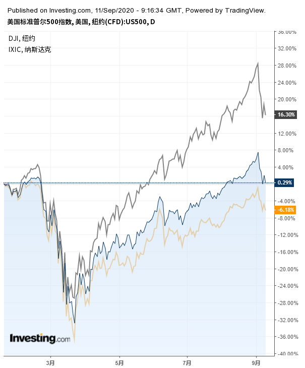 华尔街怎么了?美股从3月底反弹以来,一路走出了雄赳赳气昂昂的单边行情。但是进入9月以后,似乎应验了所有的“魔咒”。 从3月23日的低点至今,标普500指数累计上涨了42%,该指数今年来累计上涨3.3%左右,但是较9月2日的高点仍然低6.8%。同样是在9月2日,道指还从低点反弹逾56.5%,突破了29000点,创下了2月20