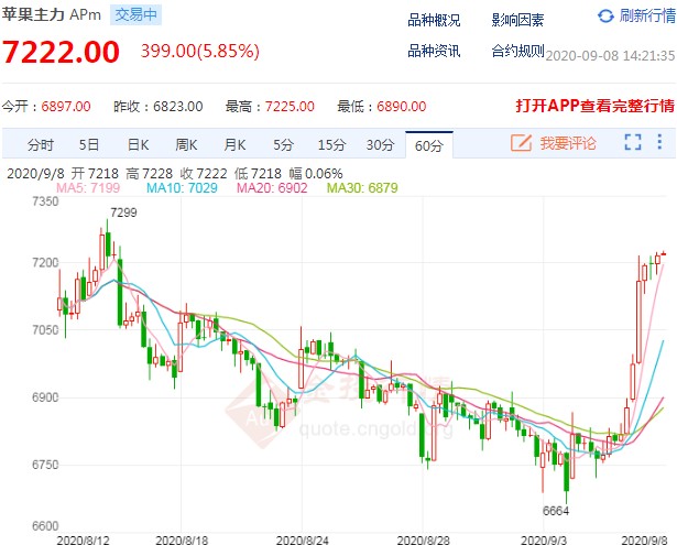 9月8日消息,苹果期货主力合约尾盘涨停,涨幅6.01%,报7233元。 因库存过高消费萎靡,5月后苹果期货合约进入了单边下行通道。05和07合约创下6300元/吨左右的历史新低交割价,2010合约从9400一路跌至7000元/吨之下。近日随着苹果库存消化逐步进入尾声,现货价格有所企稳,苹果跌幅亦有所放缓。 当