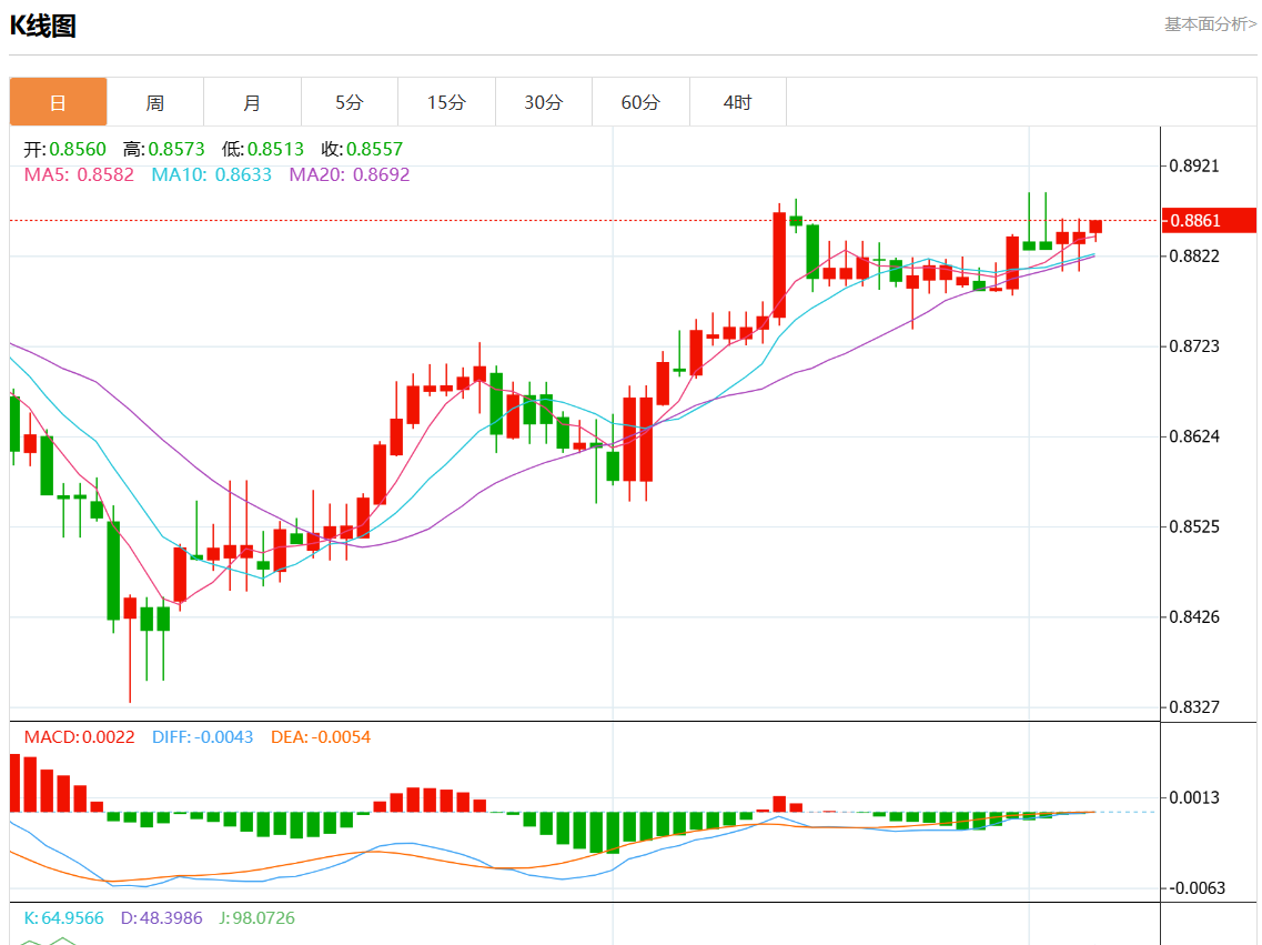 周二盘中,美元/瑞元报0.8862,涨幅0.15%。 今日分析:在0.8830之上,看涨,目标价位为0.8870,然后为0.8890。 技术点评:RI技术指标向上运行。 支撑位:0.89100.88900.8870 阻力位:0.88300.88150.8800 (亚汇网编辑:静香)