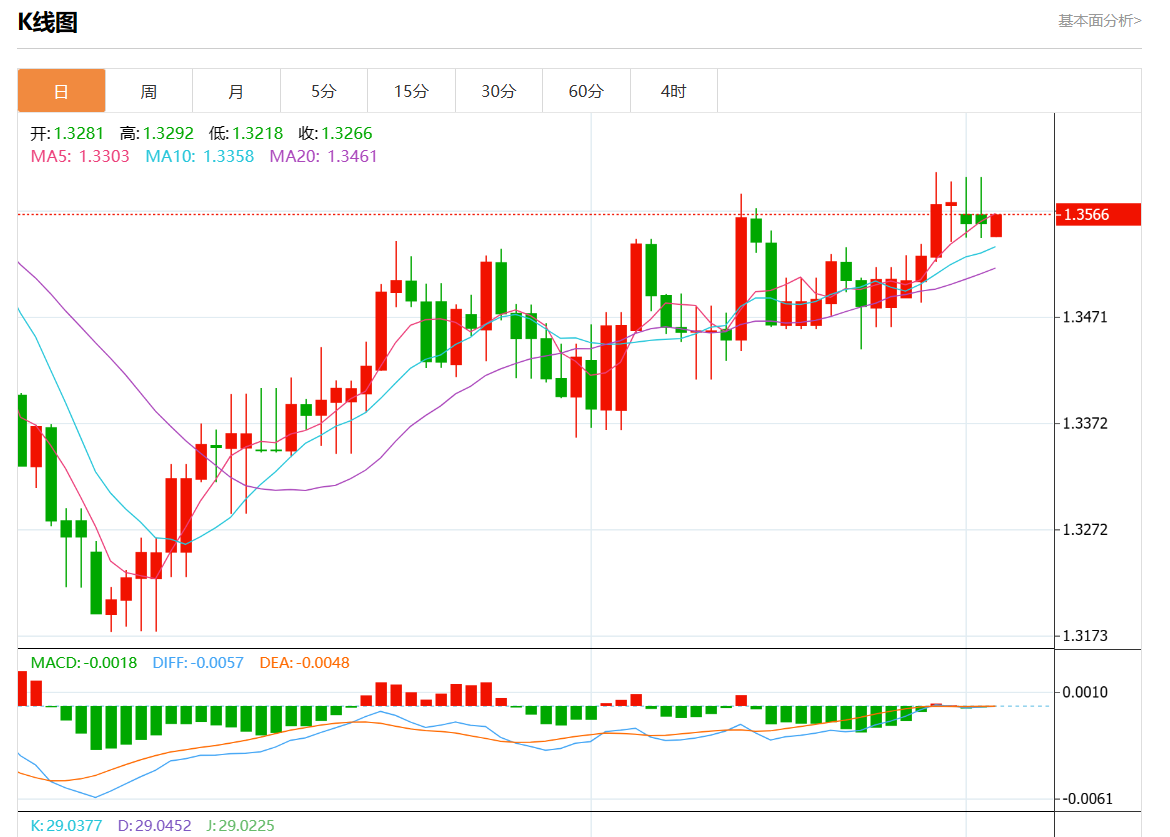 周一盘中,美元/加元报1.3563,涨幅0.04%。 今日分析:在1.3570之下,看跌,目标价位为1.3540,然后为1.3525。 技术点评:上升的空间可能被1.3570阻力位所限制。 支撑位:1.36001.35851.3570 阻力位:1.35401.35251.3510 (亚汇网编辑:静香)