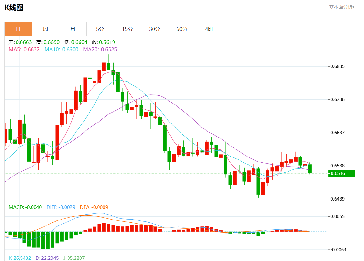 周三盘中,澳元/美元报0.6515,跌幅0.43%。 今日分析:在0.6540之下,看跌,目标价位为0.6495,然后为0.6480。 技术点评:RI技术指标向下运行。 支撑位:0.65650.65550.6540 阻力位:0.64950.64800.6465 (亚汇网编辑:静香)