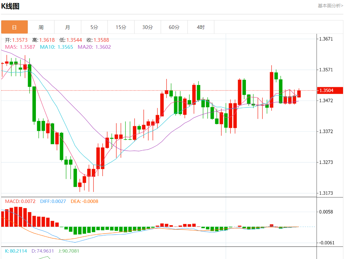 周二盘中,美元/加元报1.3503,涨幅0.12%。 今日分析:在1.3480上方做多,目标在1.3530和1.3550。 技术点评:RI显示上行势头。 支撑位:1.35651.35501.3530 阻力位:1.34801.34651.3450 (亚汇网编辑:静香)