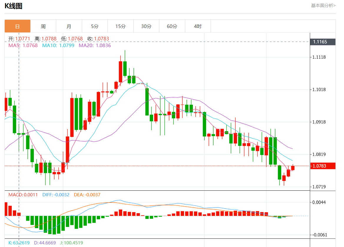 周四欧市盘中,欧元/美元最新报1.0782,日图涨0.10%. 今日分析:在1.0720上方做多,目标在1.0900和1.1015。 技术点评:RI缺乏下行动力。 支撑位:1.11501.10151.0900 阻力位:1.07201.06301.0515 (亚汇网编辑:静香)