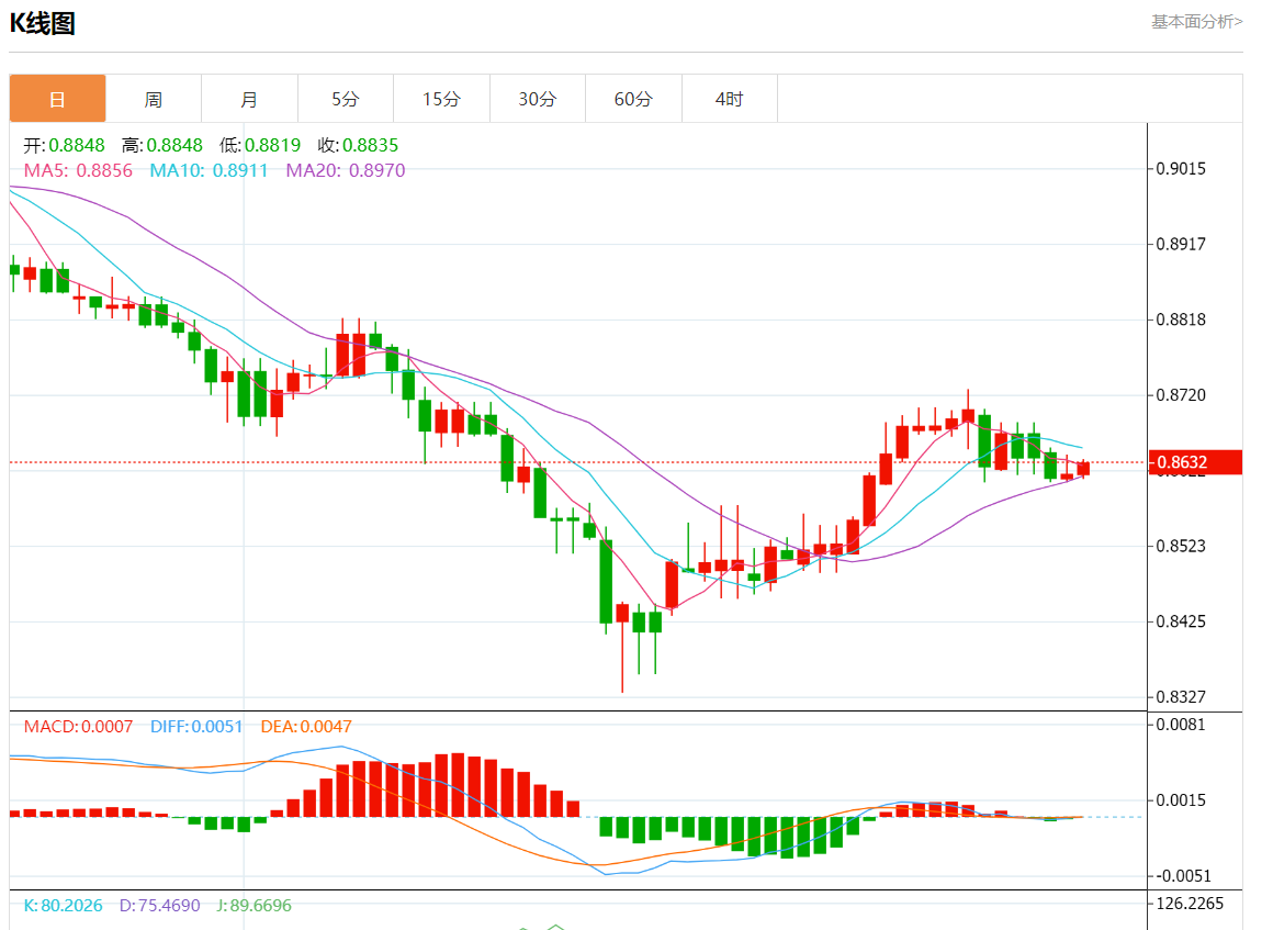 周三盘中,美元/瑞元报0.8630,涨幅0.15%。 今日分析:在0.8605上方做多,目标在0.8650和0.8665。 技术点评:RI需要新的上涨。 支撑位:0.86850.86650.8650 阻力位:0.86050.85900.8575 (亚汇网编辑:静香)