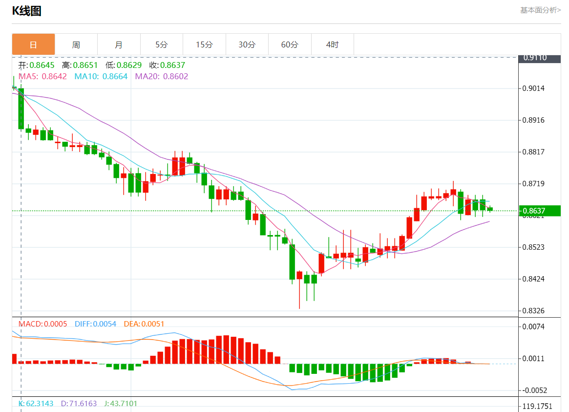 周一盘中,美元/瑞元报0.8633,跌幅0.07%。 今日分析:在0.8655下方做空,目标在0.8615和0.8600。 技术点评:只要没有突破0.8655的阻力位,跌破0.8615的风险仍然很高。 支撑位:0.86850.86700.8655 阻力位:0.86150.86000.8580 (亚汇网编辑:静香