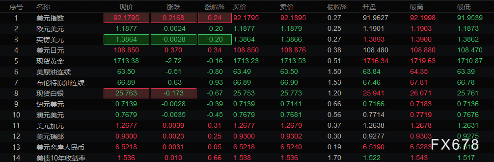 周三(3月10日)欧市盘前,美元小幅上涨,扳回隔夜的部分跌幅,目前交投于92.18附近,因美债收益率自一年高点回落之后寻获支撑,非美货币集体下挫。澳元及纽元等风险偏高货币跌幅居前,欧系货币小跌,日元再度逼近109大关。 现货黄金小幅下跌,因美元走强。目前在1711附近寻获支撑,此前两个交易日K线形成“看涨吞没”