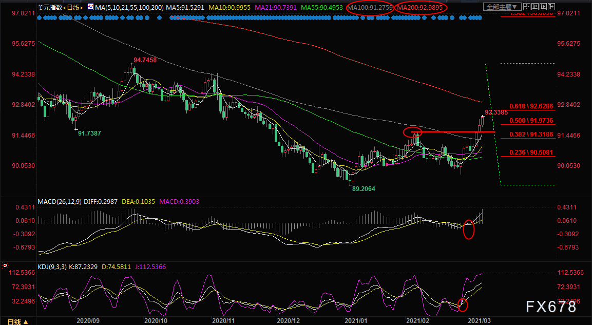 周一(3月8日)美元指数延续涨势,最高触及92.34,为11月25日以来新高。从技术面来看,美元指数自1月6日创下近三年新低至89.20以来的近三个月时间内,汇价已经初步完成了震荡筑底的过程,中长线有望迎来一波涨势,短线目标参考200日均线92.99附近。 从日线图来看,KDJ金叉运行,ACD金叉运行且上穿零轴,短期均线