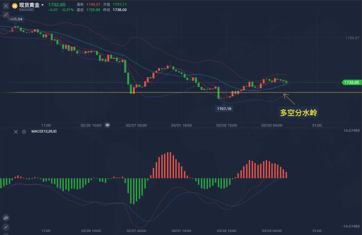 周三(3月3日)现货黄金小幅下跌,短线金价继续维持疲态,建议激进者逢高做空,保守者可暂时观望。 ★3月3日现货黄金短线走势分析 日线级别:KDJ死叉,ACD死叉。黄金周二结束此前5连跌走势,在1707附近寻得强大的支撑。短线来看,尽管金价暂时企稳,但其偏弱的走势短期难以改变,这意味着金价后市有进一步下跌的可能