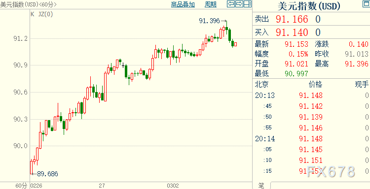 周二(3月2日)欧市盘中,全球金融市场风险情绪有所降温,不过欧洲股市悉数上涨,美国股指期货走势暗示今天华尔街势将低开;汇市方面,美元冲高之后所有回落,早前最高触及91.40;欧元、英镑等G10货币承压,欧元最低跌至1.1991,为2月5日以来首次跌破1.20关口;现货黄金波动剧烈,日内最低1707.95美元/盎司,最高1733.0