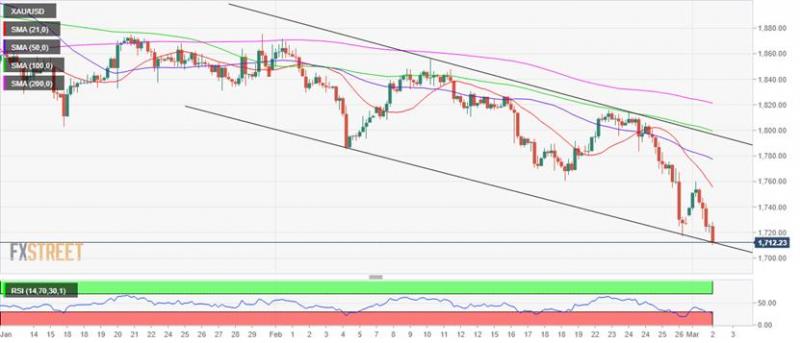 周二(3月2日)欧市盘中,现货黄金跌势难改,目前交投在1720美元下方,日内一度下探1707附近。 针对黄金的后市表现,机构FXtrt分析师Dhwaihta撰文进行简要分析,内容如下: 到目前为止,黄金在周二的交易中仍然承受着巨大的抛售压力,由于对美元的无情需求,黄金已经连续五天下跌。 在债券市场企稳之际,美国