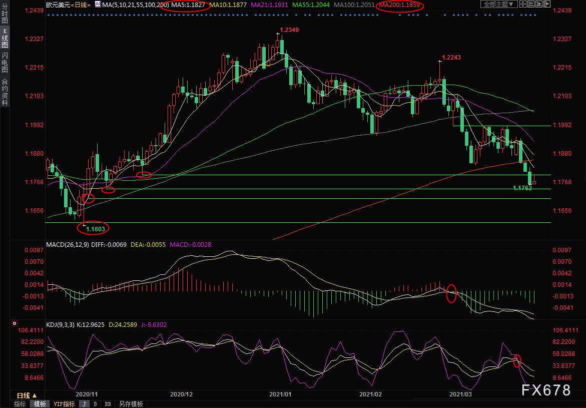 周五(3月26日)亚欧时段,欧元兑美元反弹受阻,目前交投于1.1775附近,从技术面来看,1.18关口对汇价形成压力,顶破该阻力前,汇价偏向进一步下探。 日线级别:单边下跌;ACD死叉,短中期均线空头排列,汇价失守200日均线后延续跌势,并直接下破1.18关口,K线形态显示汇价仍存进一步下跌动能,初步支撑在周四