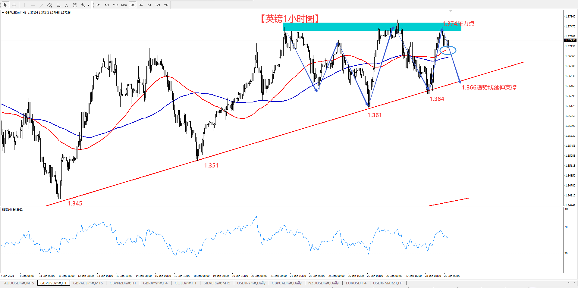 上一个交易日当中,让大家避开低位追空,而是继续等1.370,结果不出意料,英镑再上一个交易日中再次上演一出极限反转,美元也并没有站上90.9一线。主要还是受到GD数据的冲击影响下,导致市场出现这种震荡的行情。 昨天美盘时段,美国GD数据公布之后,美元迅速走低,整个市场除去美元之外都在走高,主要是因为GD数据