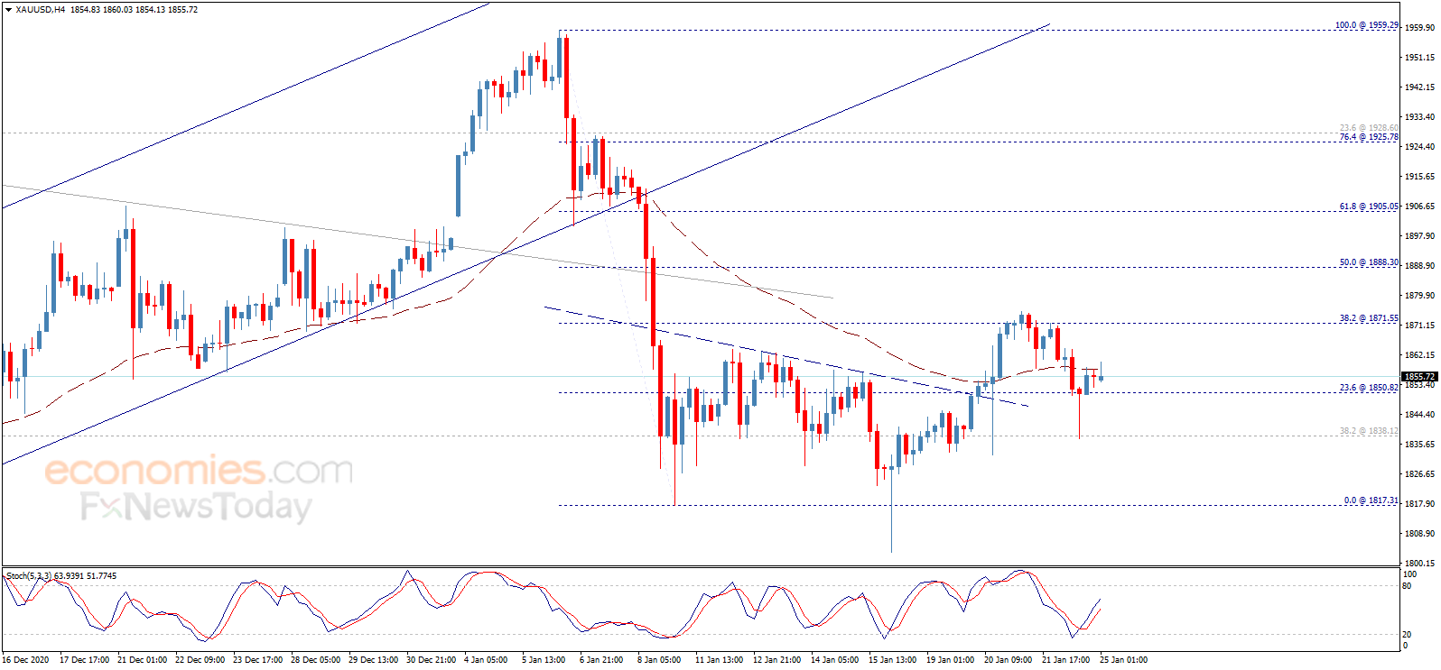 周一(1月25日)亚市尾盘,现货黄金继续承压,现报1852美元/盎司水平附近。知名财经资讯网站cooi.co周一最新撰文,对日内欧元/美元、英镑/美元、美元/日元和黄金走势进行前瞻分析。 根据cooi.co,假如失守关键支撑1850.80美元/盎司,金价面临进一步大跌的风险。 以下是cooi.co所撰文章的