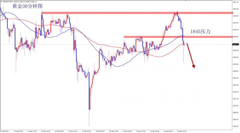 黄金今日早盘先涨,欧盘遇阻1857阻力后回落,当前加速下跌,再次回踩昨日美盘低点位置,大阴杀跌,行情转空,美盘反弹依托1850干空! 黄金底部震荡,多空频繁转换,任何的压力支撑都可能成为行情转折的关键!当前黄金受到1830一线支撑后反弹,上方重点关注1850压力,此位置下黄金的反弹视为下跌过程中的正常修
