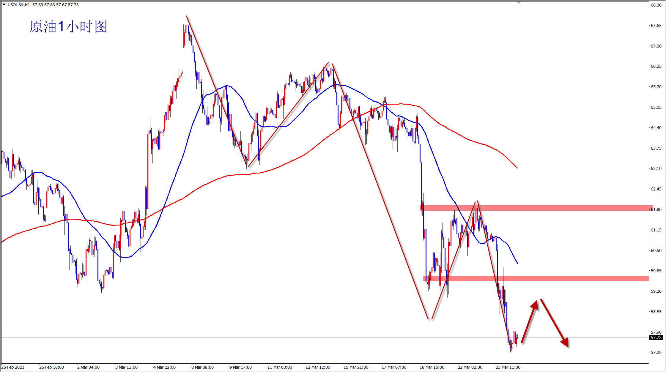 原油昨日再次大跌,但是当前在57一线获得支撑,大跌后需震荡修正,今日原油58下方可以短多,反弹至59-60区域后再空! 原油已经完全开启跌势,这是毋庸置疑的!68高位将会成为本次波段上涨的阶段高点,接下来是回调下跌走势,而当前经过三波强势下跌,现在57位置是此前上涨过程中最后一次盘整支撑位置,原油经过大跌后需