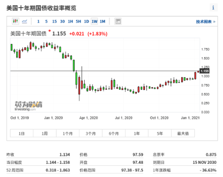 2020年基准美国十年期国债利率累计下跌超过50%,但是,在时间进入2021年以后,情况似乎立刻发生了一百八十度的巨大转变,1月以来,十年期国债的收益率已经飙升了25.61%。 美国十年期国债收益率周线图 随着民主党一举拿下美国国会参众两院的控制权,国会未来批准更多刺激法案的可能性被大大提升了