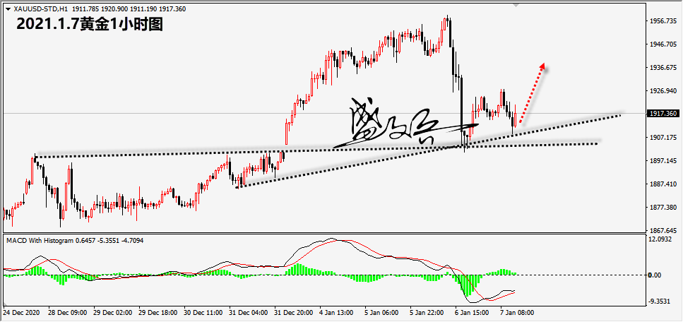 黄金 黄金经过昨日的大跌后,今日白盘维持呈现震荡修正的格局。晚盘重点关注美国经济数据以及美股的走势对于黄金的影响。本周的重点是明日的12月非农就业数据。 黄金周三从高位大幅的回撤后,今日震荡修正昨日的跌幅。从整体趋势上,黄金多头趋势保持完好,从位置来看,1900关口强支撑仍然有效。