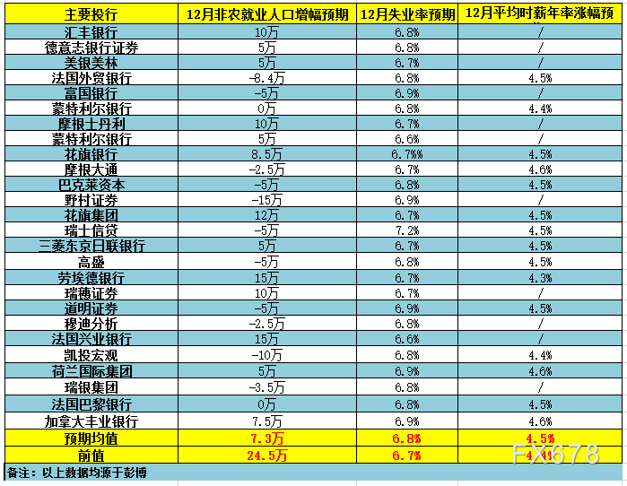 北京时间周五(1月8日)21:30将公布美国12月季调后非农就业人口变动和失业率,周三(1月6日)包括摩根士丹利(orgataly)在内的26家大型投行发表了对此次数据的前瞻,具体如下。 26家大型投行预测显示,主要投行对12月非农就业人口的增幅预期再度出现负值,且各投行之间的预期差距较大,具体而言,美国12月季调