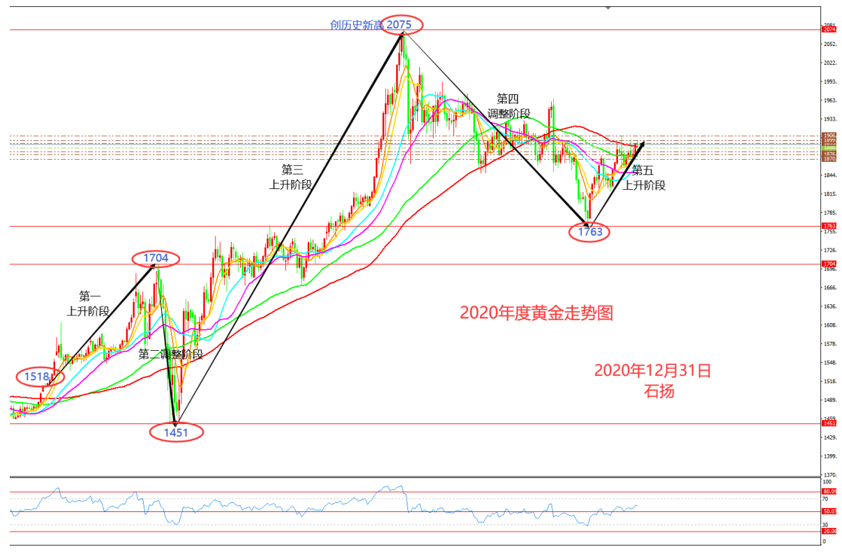 2020年是不平常的一年,2020年的黄金更是超级疯狂的一年,从年内的低点1451美元/盎司,到最高点2075美元/盎司,黄金价格上涨了624美元,创出了世纪高点,走出疯狂行情。关于2021年的黄金走势预期,从技术上来说,是比较简单的,价格突破层层压力,强势拉升弱势回调,这样将大概率还有新的高点。但在基本面上,仍然是