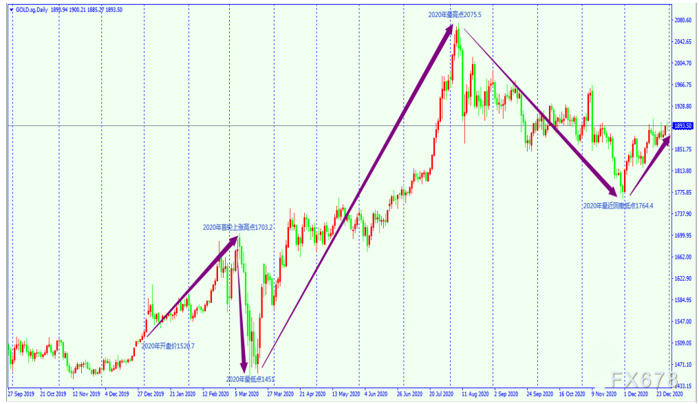 综述:2020年金银价格一致刷新历史高位,创十年最大涨幅。对于2021年行情,随着疫情的持续V随着疫苗的逐步普及,市场对金银能否续涨存在分歧。但我们预计,整体来看,2021年黄金价格有望继续上行,或将再创历史新高。黄金周图分析详见下文最后。 回顾:2020年国际现货黄金价格从1520美元/盎司开始,3月份最低1