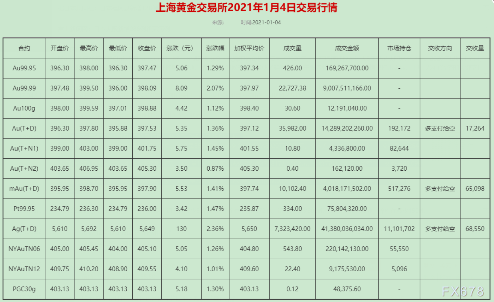 周一(1月4日)上海黄金交易所黄金T+D收盘上涨1.36%至397.53元/克;白银T+D收盘上涨2.36%至5649元/千克。金价收涨,主要因假日实物黄金需求旺盛,美国政局担忧升温,欧美疫情升温市场担忧未来经济前景,以及英国脱欧之后对英国政局的担忧等,多种因素推动金价上涨。 上海黄金交易所2021年1月4日交易行情,黄金T+D