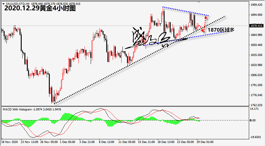 周二(12月29日)欧市盘中,现货黄金刚刚短线拉升重返1880美元关口,美国众议院周一以275-134的投票结果通过了一项向民众发放2000美元疫情纾困支票议案。 针对黄金后市表现,forxliv分析师JutiLow撰文进行简要分析,内容如下: 由于市场交投清淡,随着今年即将结束,金价走势并不乐观,因为买家发现,
