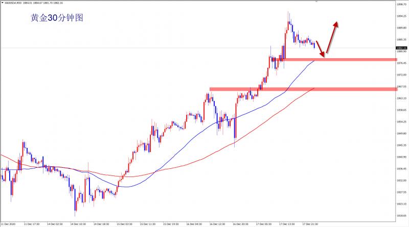 周五(12月18日)亚洲时段,现货黄金小幅下跌,交投于1880上方;周四(12月17日)金价上涨逾1%,至一个月高点,收于1885.42美元/盎司,因市场预期将出台更多的新冠救援措施,以及美联储承诺向经济注入更多资金并维持低利率,导致美元下跌。 美国的财政纾困法案已经出台在即,而美联储决议带来的影响也继续推升