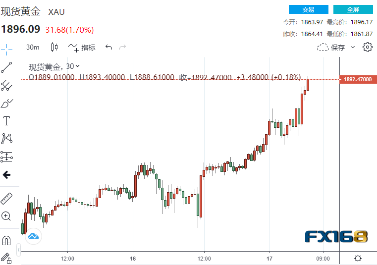 周四(12月17日)欧市盘中,现货黄金持续上攻,暴涨超30美元,最高1896.18美元/盎司,COX期金站上1900美元/盎司,涨幅2.19%。现货白银站上26美元/盎司,为9月21日以来首次。COX期银日内大涨5%。 分析认为指出,在欧洲时段中,黄金维持了强劲的买盘基调,并在过去一小时内创下了一个月新高,在1884美元附近。
