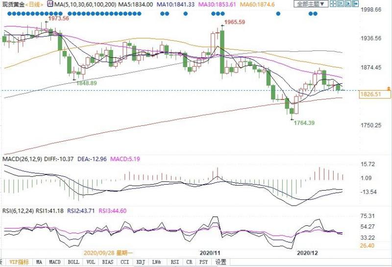 黄金 黄金周一在市场情绪偏好的影响下,黄金的避险功能消退,金价一度大幅的走低至1819美元附近。但是美国公布刺激方案细节和综合性支出法案达成一致,提振美元指数反弹修正跌幅。本周的重点仍是美联储利率决议和美国财政刺激方案的达成。 黄金从技术面来看,黄金日K线继续连阴,金价在1820一线获