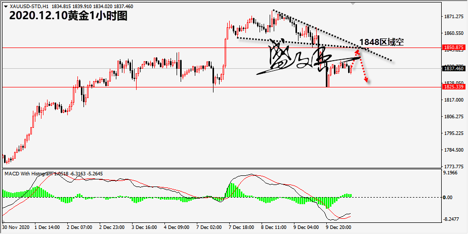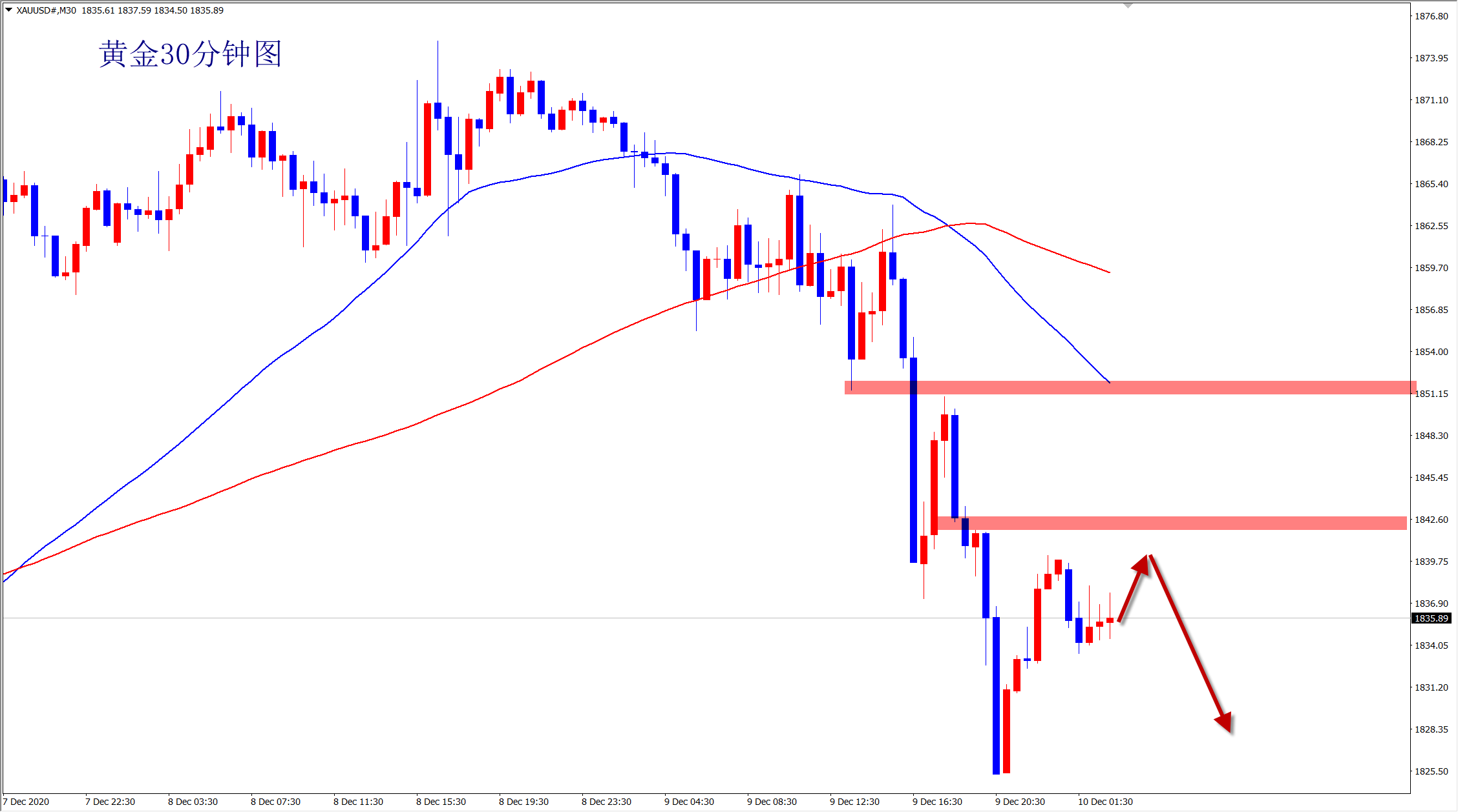 周四(12月10日)欧市盘中,现货黄金仍维持跌势,目前交投在1830美元附近,白银试图重返24关口,原油价格维持升势。 针对日内黄金、白银及原油价格走势,瑞讯银行撰文进行简要分析,内容如下: 黄金:预期目标1815.00 转折点:1850.00 交易策略:在1850.00下方保持看空,目标位依次看向1825.00