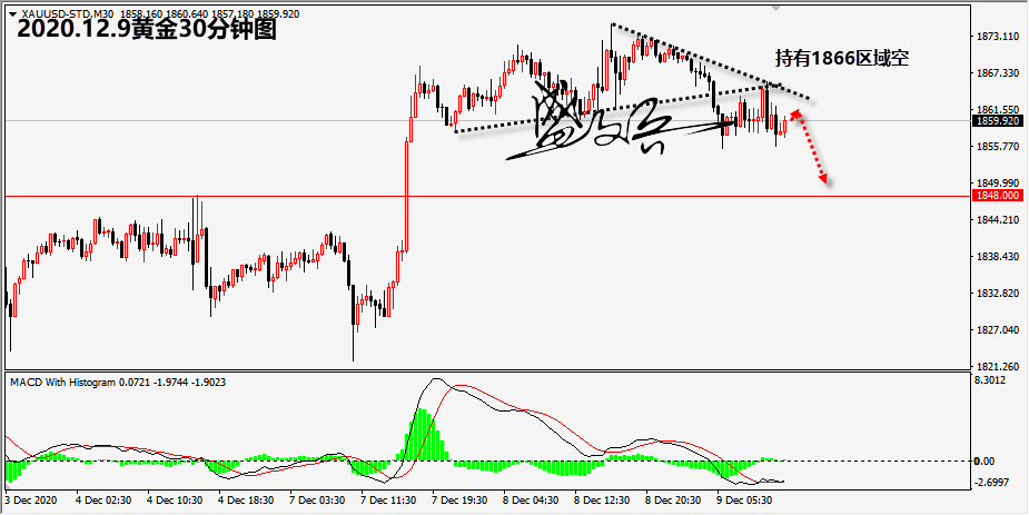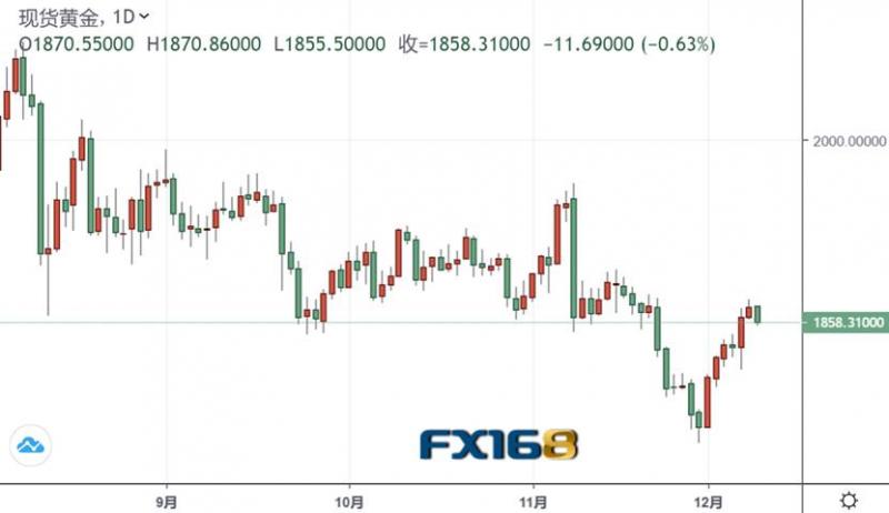 周三(12月9日)欧市盘中,全球市场风险情绪持续高涨,欧洲股市主要股指悉数走高,美国股指期货多数上涨;汇市方面,美元承压,最低跌至90.89,欧元冲高回落仍然交投1.21关口上方;英镑/美元明显上涨。在风险情绪升温之际,现货黄金遭遇大幅抛售,最低跌至1851.29美元/盎司,最多大跌近20美元。分析认为,市场仍然在押