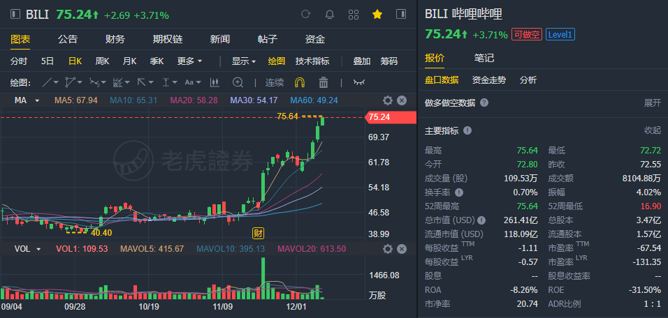 12月8日美股盘初,哔哩哔哩直线拉升,盘中涨幅一度扩大至4%,续刷历史新高。截至发稿,哔哩哔哩涨幅收窄至3.71%。