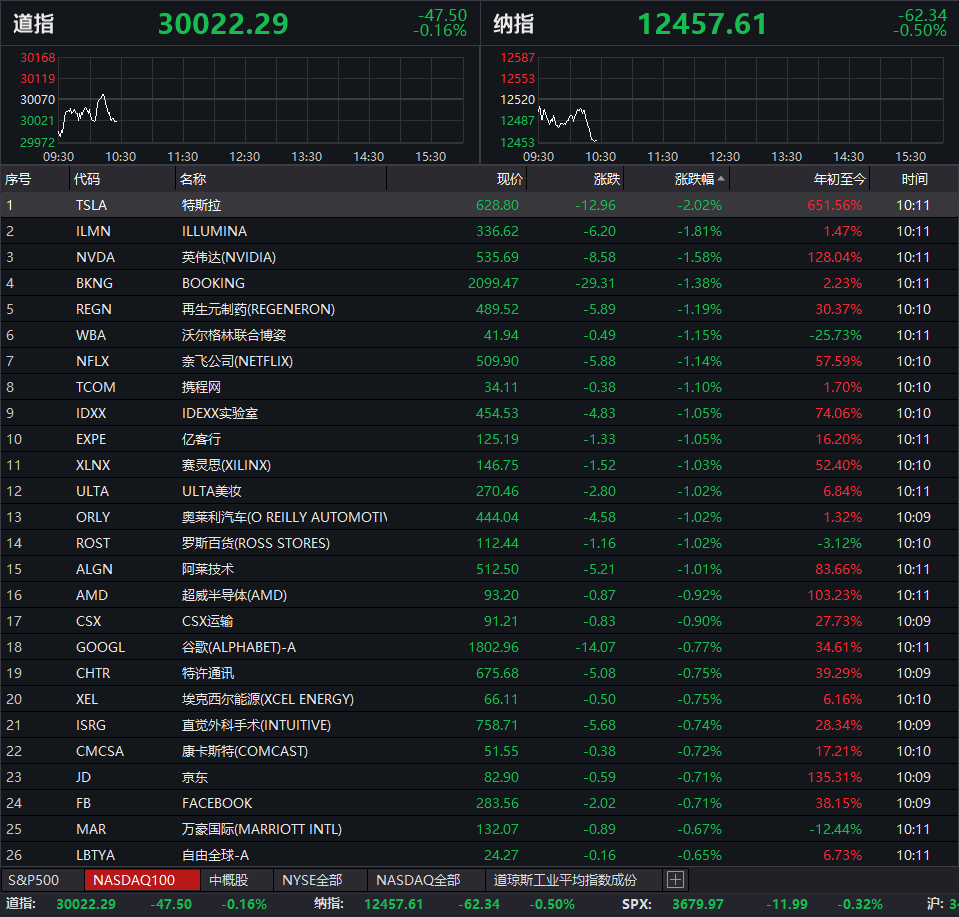 12月8日美股盘初,纳指快速走低,新下跌0.5%。成分股中特斯拉、英伟达跌幅居前。 此外,明星科技股多数下行,tflixIc.跌超1%,谷歌A、Facook、高通跌超1%。