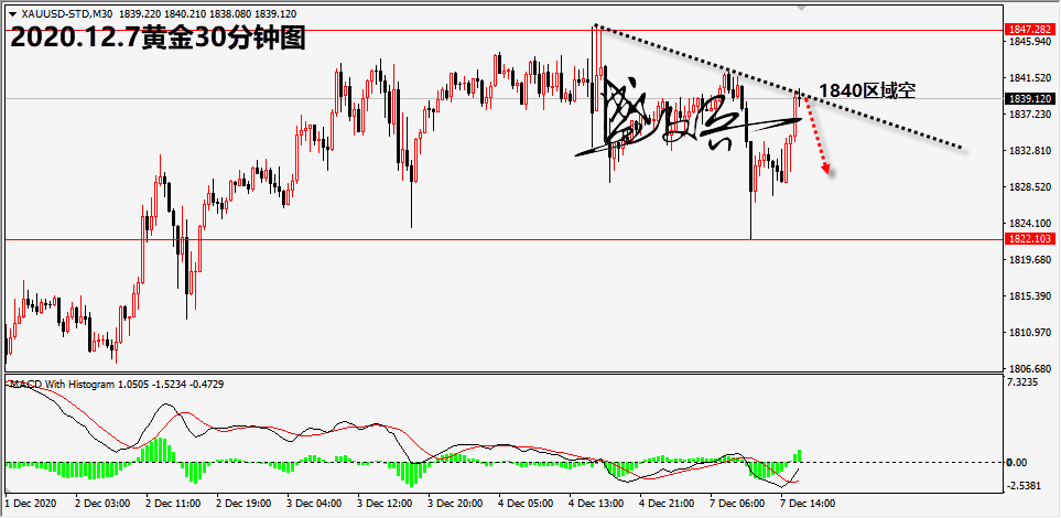 黄金欧盘行情大跌,我们1837空如期大跌止盈,随后在1823位置获得支撑,行情深V反转,黄金再次转多,接下来美盘低多看涨,依托1844低多! 黄金当前属于上涨遇阻后的震荡,多次下跌遇阻在1823位置获得支撑,多次深v反转,说明行情依然非常强势,我们依然继续低多看涨,黄金接下来要突破周五的高点继续创出新高,
