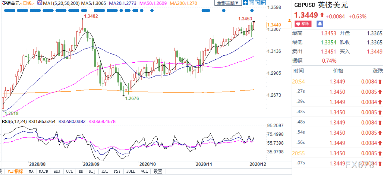 周四(12月3日)欧市盘中,英镑兑美元加速上涨触及9月1日新高1.3453,虽然此前欧盟外交官称在渔业方面仍存在重大分歧,但他至少透露了会谈仍在推进中,并继续试图攻克此前遗留下的难题,而这仍然推动了市场乐观情绪复燃,此外新冠病毒疫苗方面的积极消息和美国财政刺激计划带来的乐观情绪持续对酵,美元跌至逾两年半低