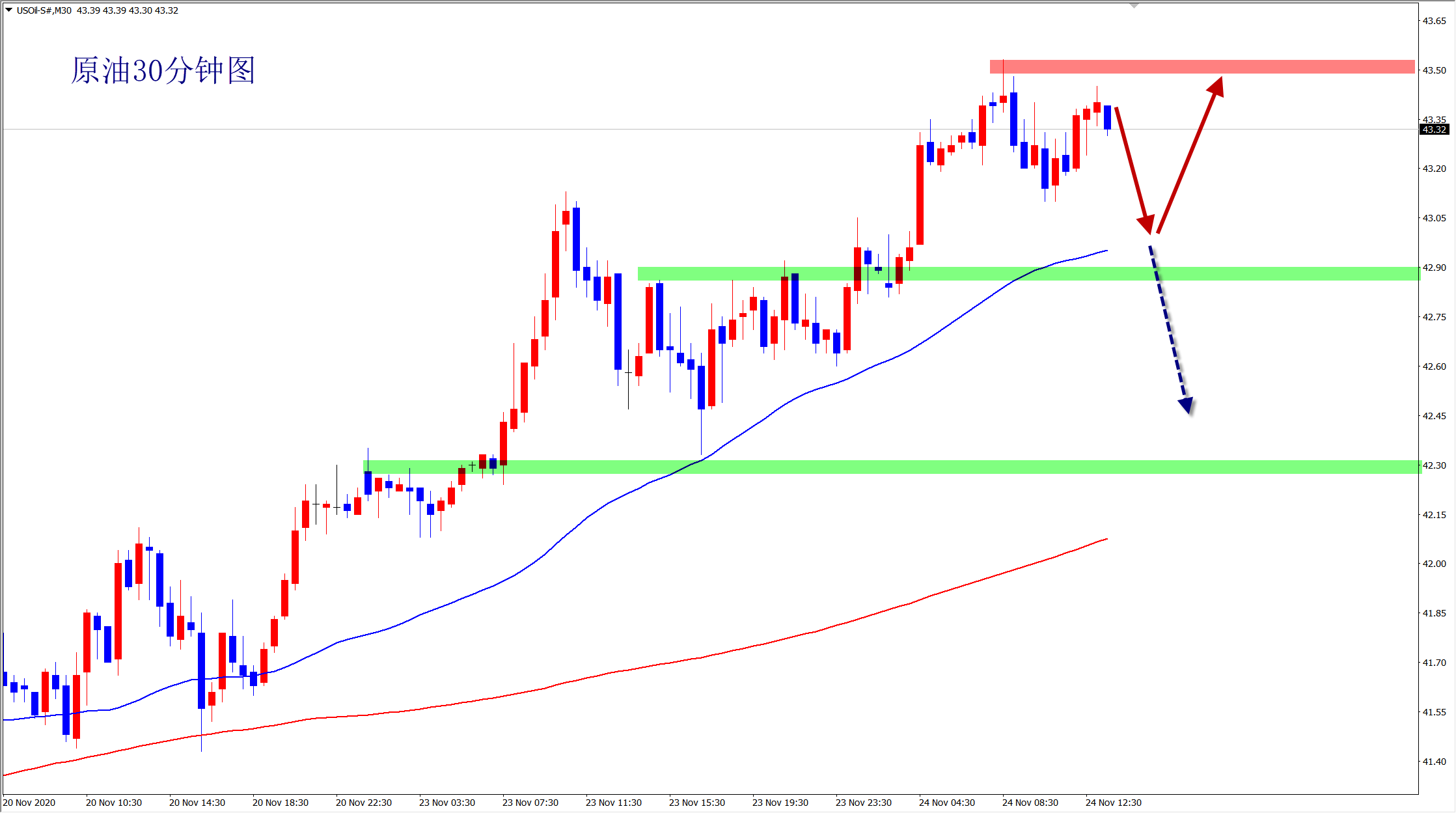 原油遇阻前高压力,日内两次上涨没有突破,强不再强必转弱,美盘依托43.5阻力先短空,下方关注42.9支撑,破位的情况下看跌至42.5一线! 原油从走势上看是多头上涨走势,但是因为面临前高周线阻力,而且今日两次上涨都没有突破,并且从4小时走势上看,原油已经过小5浪的上涨模式,而且上涨出现了衰竭的迹象,加