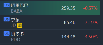 11月16日,中概电商股集体下跌,京东跌超7%,拼多多跌超4%,阿里巴巴跌0.57%。