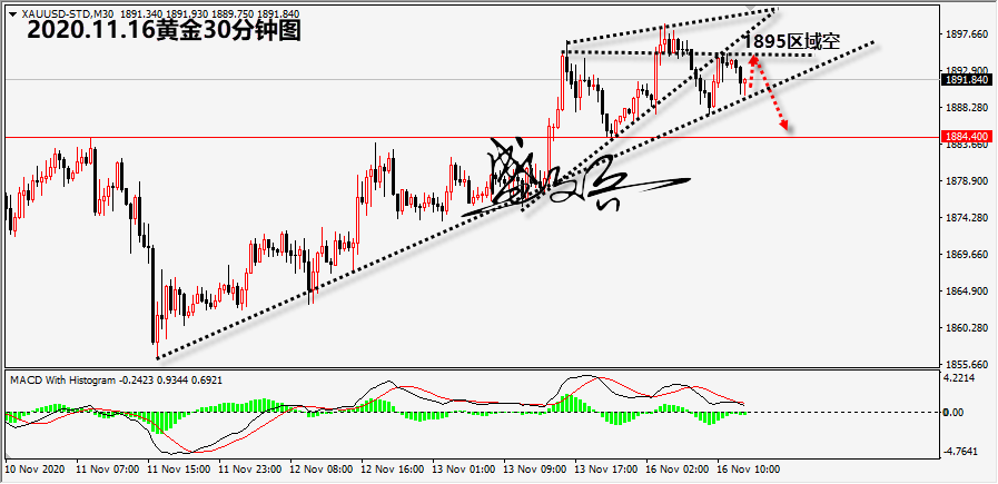 11月第二周黄金先跌后涨,在国际局势不稳的情况下,有单日大跌110美金的行情,也有周四周五连续反弹的力度,最终收盘在1888附近,技术走势上,1850区域终归是守住了,短期已经不具备继续下跌的条件了,行情进入震荡周期。基本面上,还是美国大选的混乱局面余温未了,美国新旧总统权力交接期以及川普支持者大规模集会