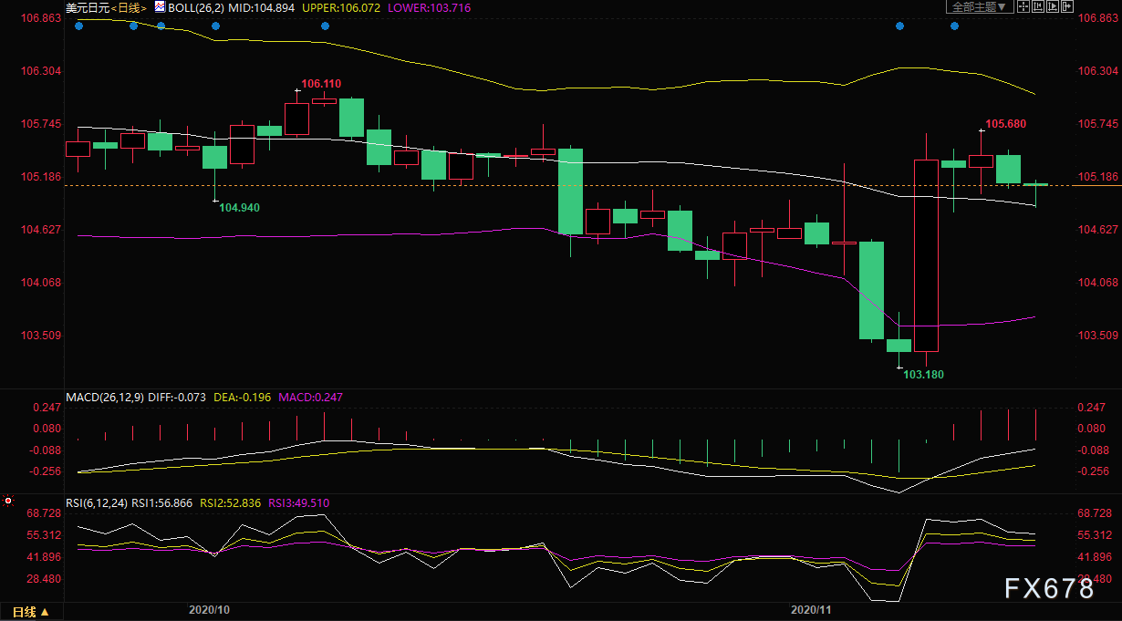 周五(11月13日)殴市盘初,美元兑日元一度创三日新低至104.86,尽管随后反弹,收复日内多数跌势(目前跌约0.01%),但随着新冠病毒感染人数继续大幅上升,人们担忧欧美难捱的冬季对经济造成打击,投资者重新考虑买入避险货币日元。另外,特朗普不承认拜登胜选美国总统,令美国政治和经济不确定性增加,也导致投资者对