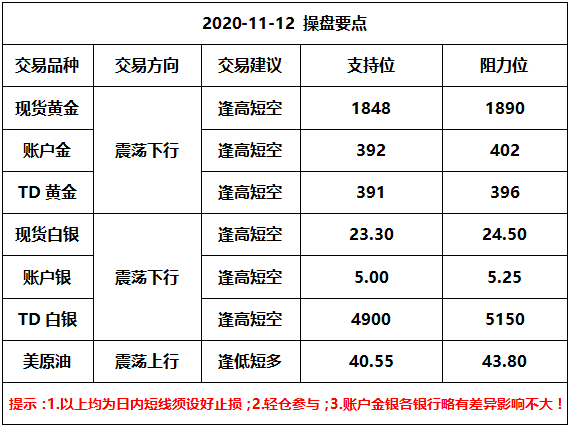 周四(11月12日)金银T+D有所分化!现货黄金跌至1870下方,美元指数一度升至93关口上方,而美债收益率也高位徘徊,隔夜美股也有所走高,这令黄金短期仍无吸引力,全球风险资产波动加大,但不妨碍中长期继续看涨。美国大选仍存变数,美国总统特朗普的竞选团队周三又采取了法律行动,在密西根州提起诉讼,试图扭转特朗