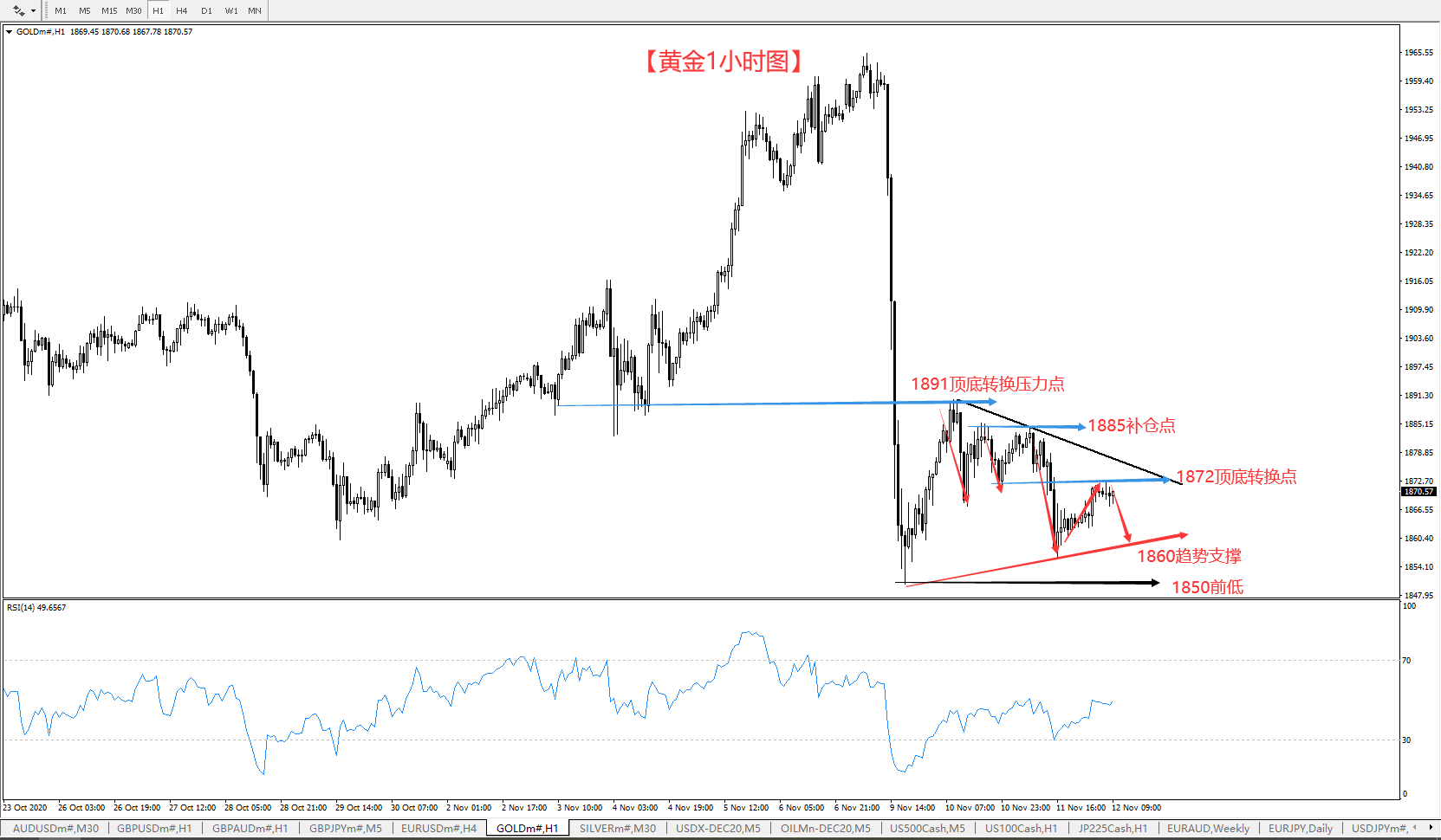 弱势下行,破位1860,走势处在预期,时间换取空间!昨日盘黄金价自1880美元上方承压走跌,盘中有效下破位1860美元支撑后延伸至最低的1856美元,随后有所反弹,最终价收于1865美元附近,今早间截止到目前价格触高1872美元。 疫苗所带来的利好情绪导致黄金空头放量大跌,一日内跌幅高达百点之多,毫无疑问也是过