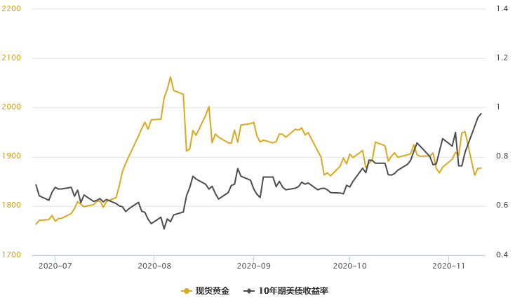 周三(11月11日)金银T+D双双收跌!现货黄金回到1880美元/盎司下方,全天整体窄幅震荡,国内贵金属T+D普遍走低,市场风险偏好情绪回暖对黄金不利,因无息黄金的机会成本不断上升,美元走高,而10年期美债收益率升至今年3月20日以来的近八个月新高0.975%,这令黄金承压。不过,黄金中期前景仍向好,瑞银全球财富管理分