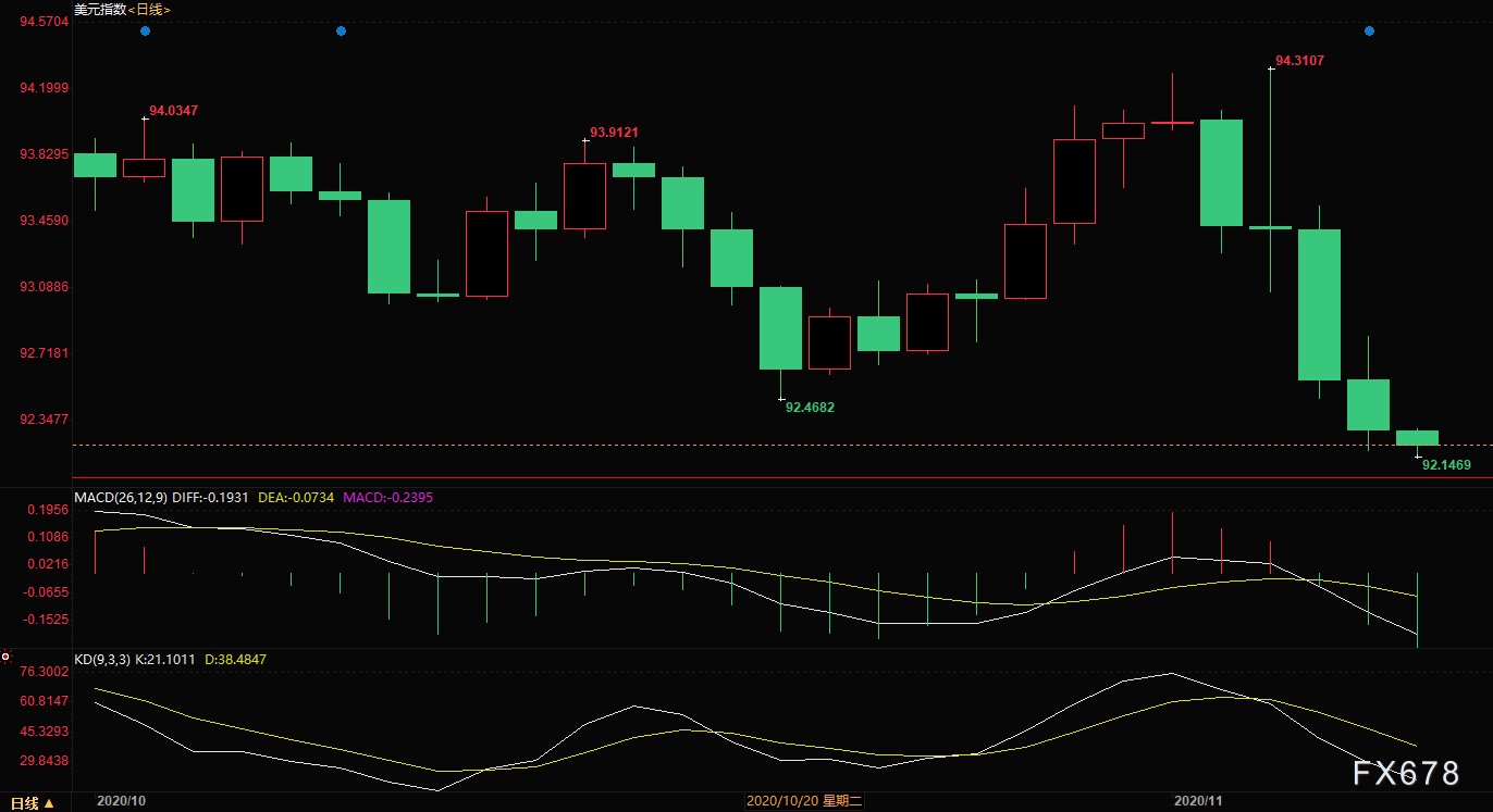 周一(11月9日)亚洲时段,美元兑一篮子货币跌至逾两个月最低,美国总统大选的计票工作仍在进行,预计国会两院仍将分别由两党掌控,投资者预测美元将进一步下跌。拜登当选美国总统,呼吁国人弥合分歧,承诺迅速采取抗疫行动,并实现有序权力交接。而特朗普仍拒绝承认败选,其竞选团队提起一系列诉讼和重新计票要求,但